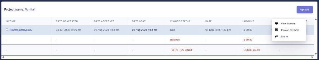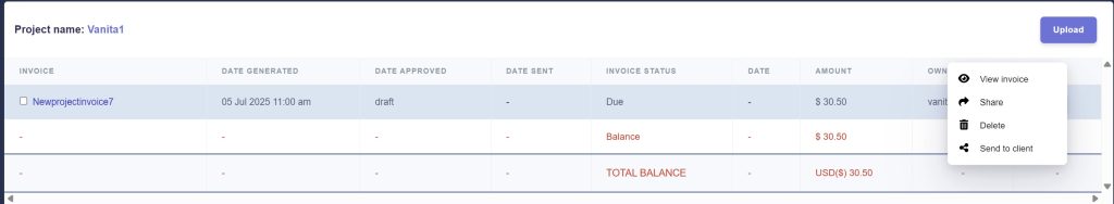 Initially, invoices are in draft form. Once you approve and send them, the related dates are automatically recorded. This automatic recording helps you maintain a clear record without manual intervention. Invoices can be sent directly from the generated invoice section after preview or stored as drafts in invoice documents and sent or shared via the menu options for each invoice.