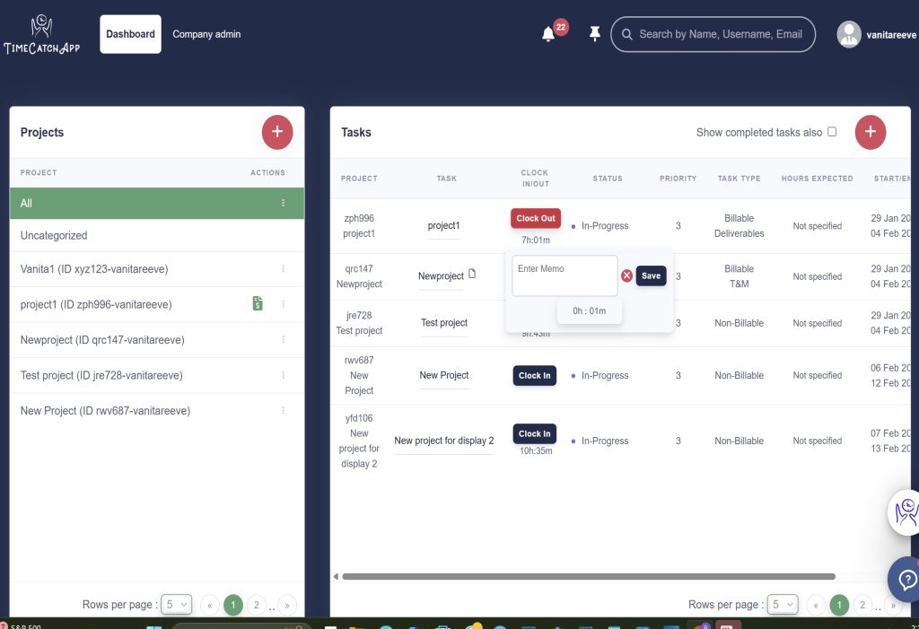 Start clocking in by clicking on the clock in button and updating memos for each session to track how your time is spent on various tasks.